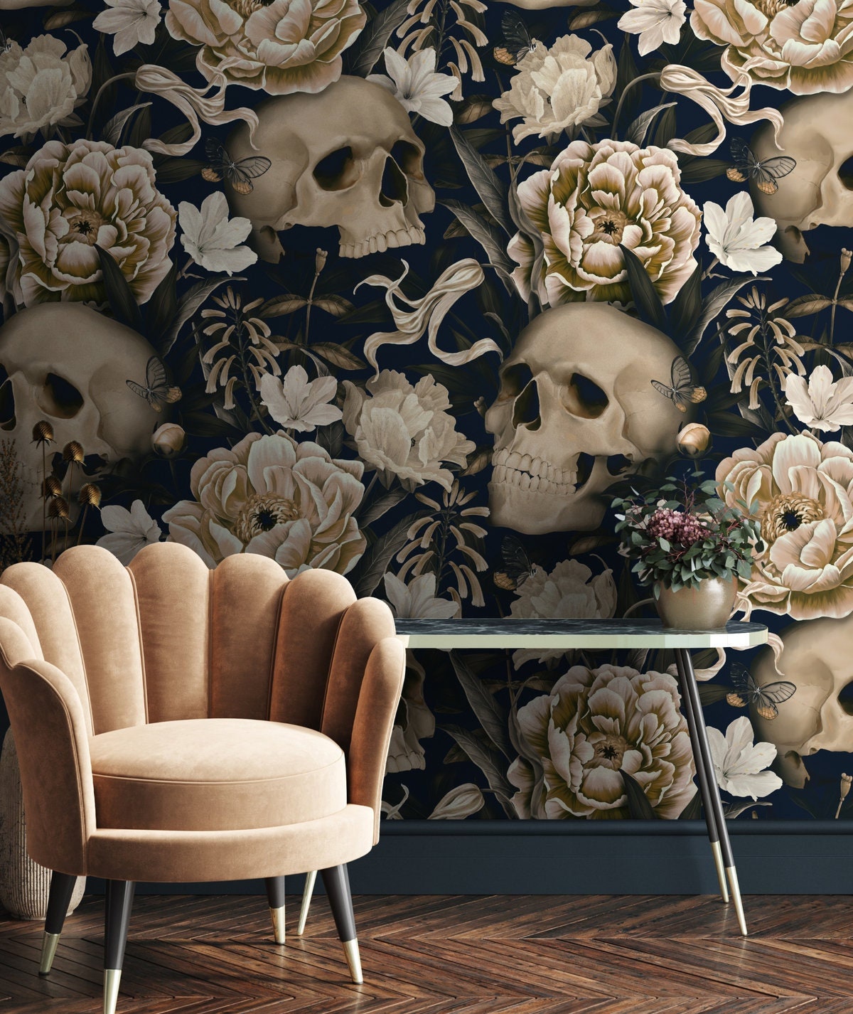 Dark Floral With Skulls Wallpaper Gothic Flower Wall Mural Etsy Denmark